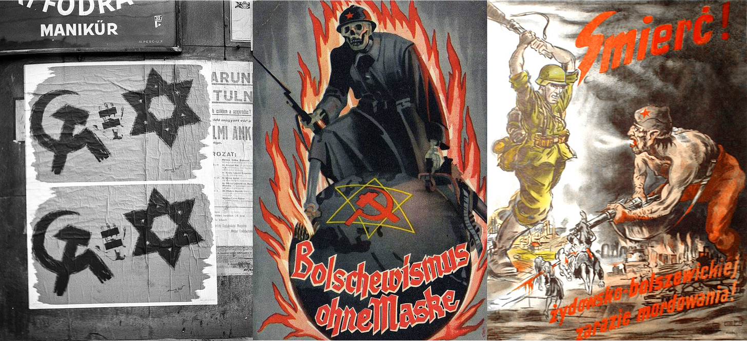 Nazi figures like Alfred Rosenberg and Adolf Hitler drew heavily on these ideas. Hitler described Bolshevism in Mein Kampf as “Jewry’s twentieth-century effort to take world dominion unto itself.” In Nazi propaganda, “Jew,” “communist,” “Marxist,” “Bolshevik,” “Soviet,” and even “Slav” became interchangeable terms for an existential enemy. Eliminating communism became a central ideological mission, with Jews as the ultimate scapegoat alongside other groups marked for subjugation or destruction, including Slavs and Soviet citizens. This conflation of Jews with communism spread from Russia not just to Germany, but also to Poland (where it is referred to as Żydokomuna), Hungary, Finland, the UK and the US.